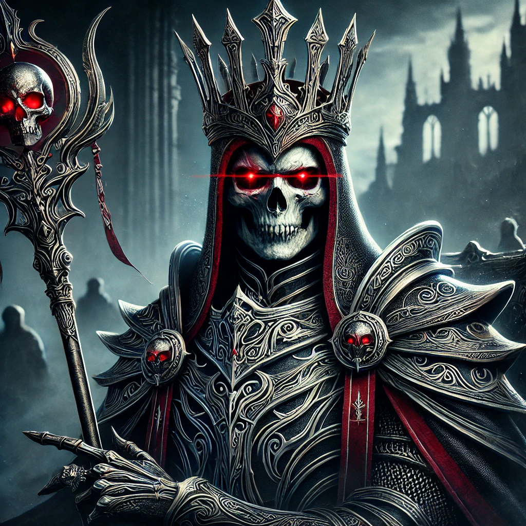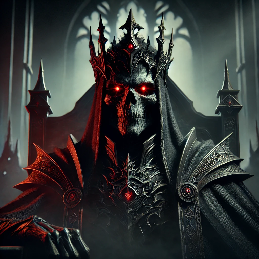 - 외형: 화려한 왕관과 검은 망토를 두르고 있으며, 피부는 잿빛으로 빛나고 눈에서는 붉은 빛이 발산됩니다.
